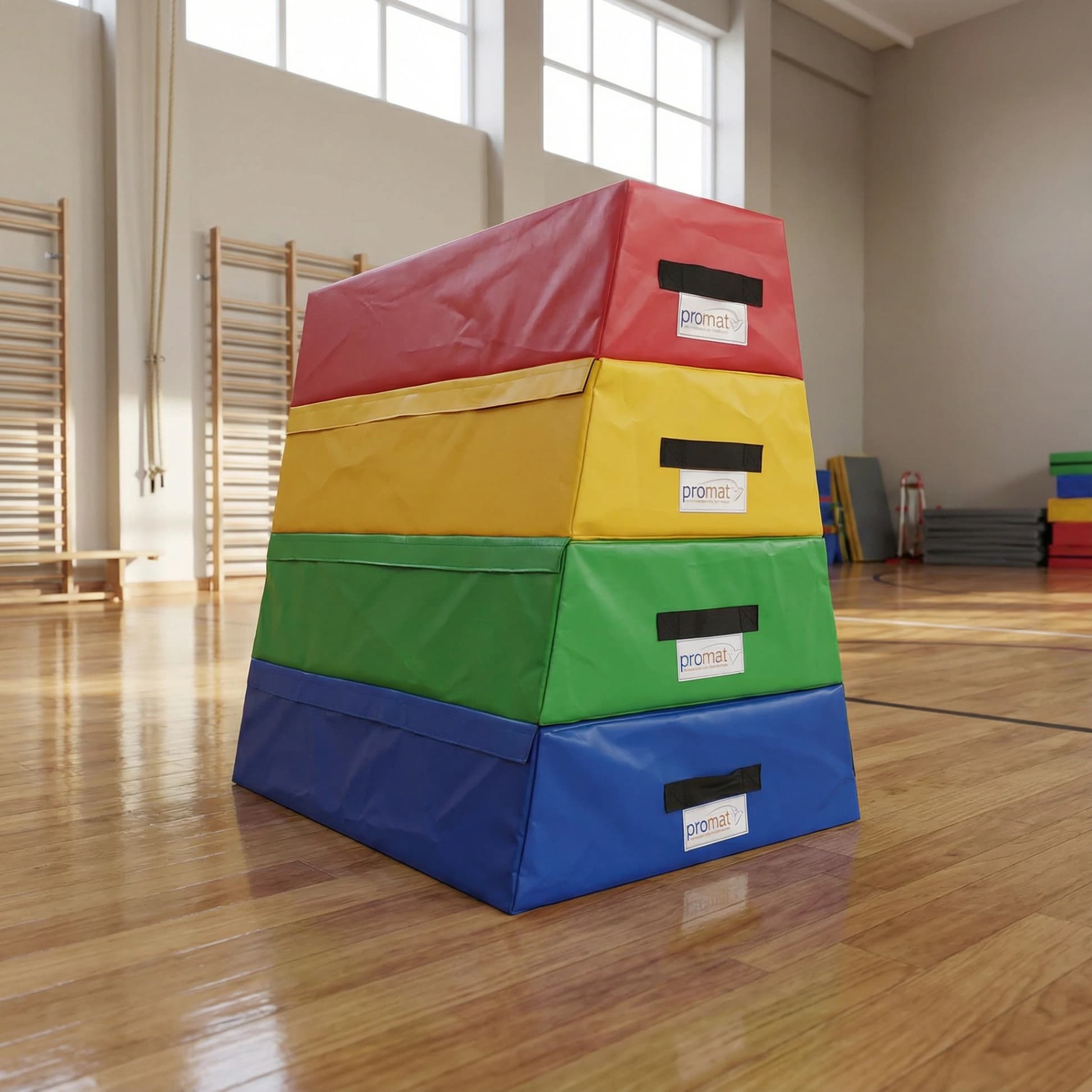 The Promat™ 4 section vaulting box, is made from 4 segments which can be used individually or together. This can be done simply by placing each section on top of each other and connecting them with the hook and look connecting flaps, it is constructed from a high density, shock-absorbing PU foam that is wrapped in a heavy-duty, flame retardant PVC cover for durability.