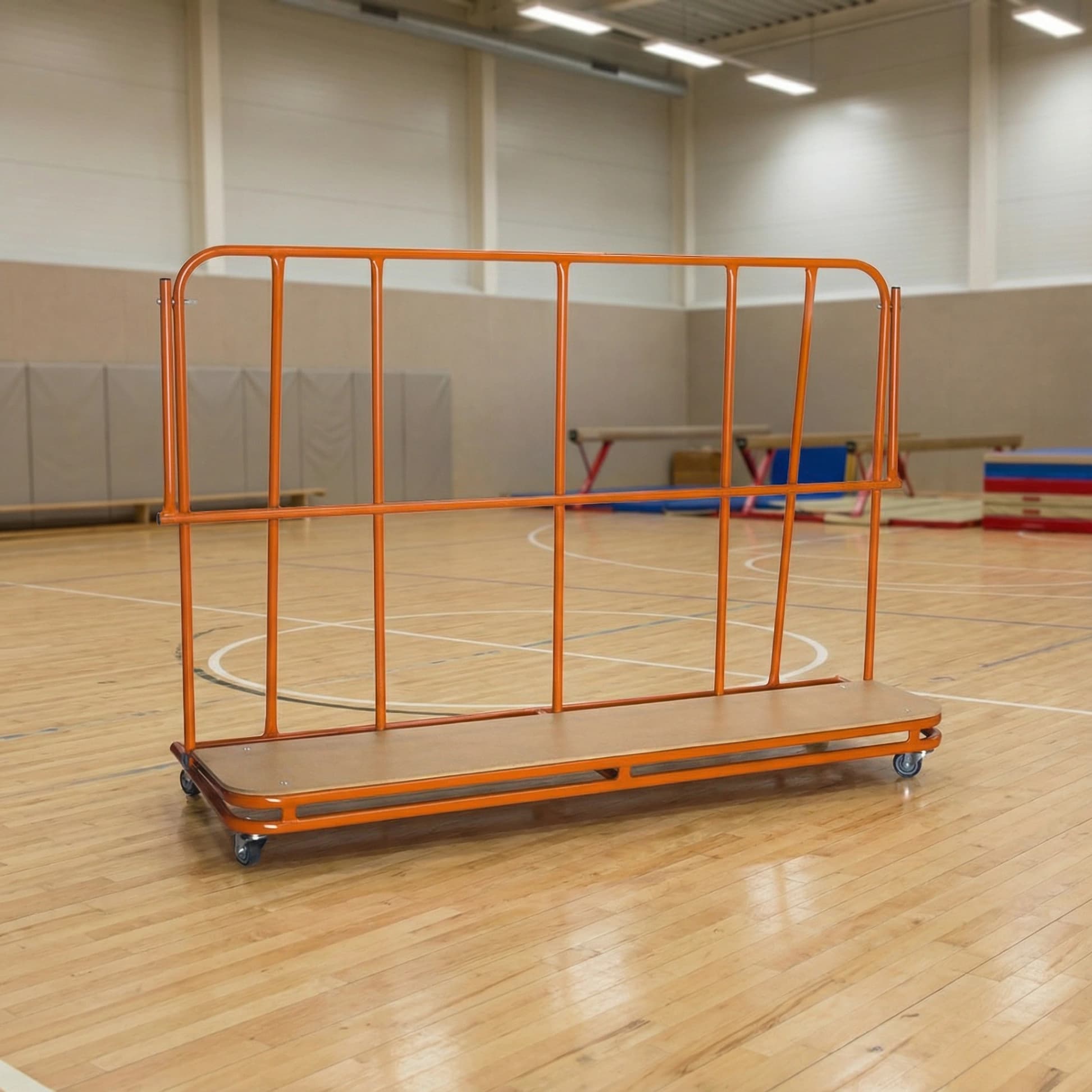 The red folding handle on this inclined vertical trolley holds mats firmly in position and the back support is angled for extra support.