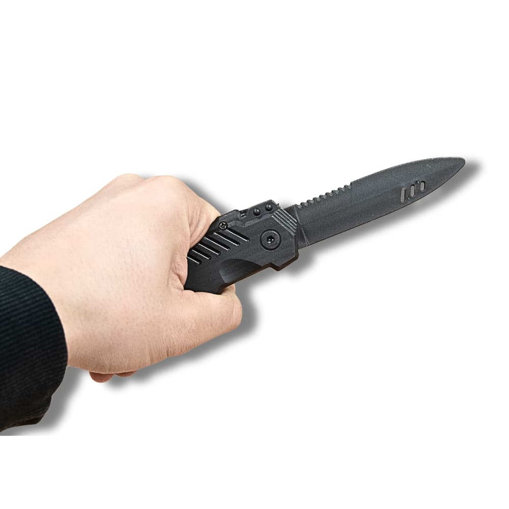Realistic retractable training knife with a 12 cm body and 9 cm blade that retracts on impact. Safe for police, security, and scenario-based training.